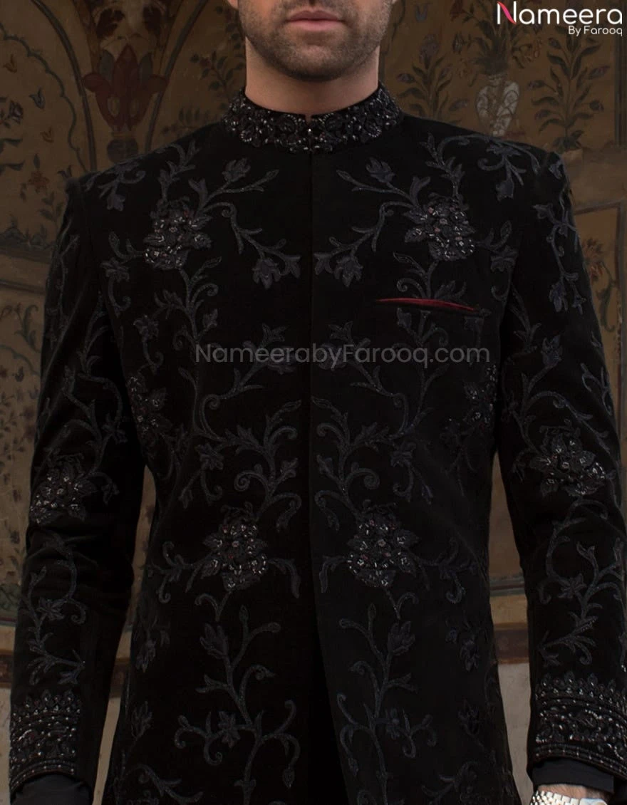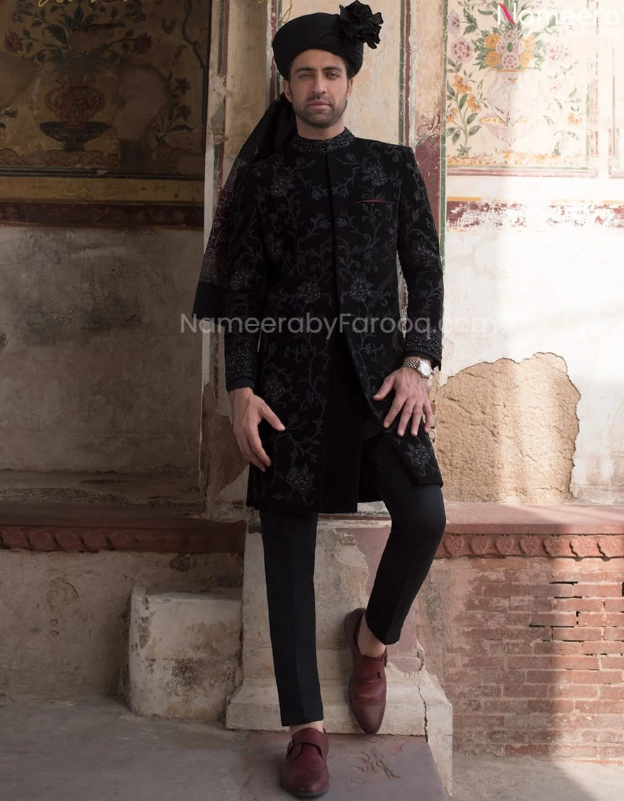 Black Sherwani in Corduroy Fabric with Turban is Embellished Sherwani With Red Contrast Pocket Liner. The Embellishment is done in modern style paired with Straight cut trousers. It is an Amazing Mens Sherwani in Black Color to wear on your Barat in combination with your bride’s red dress.