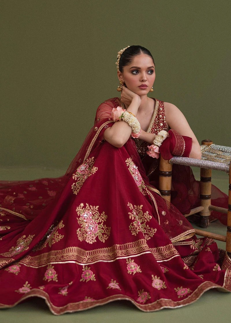 The Wedding Lehenga in magenta color has premium silk fabric. The Lehenga is gracefully hand-embellished with goldwork and gota details, creating a flawless Pakistani Wedding Dress to have a luxurious Mehndi Dress.