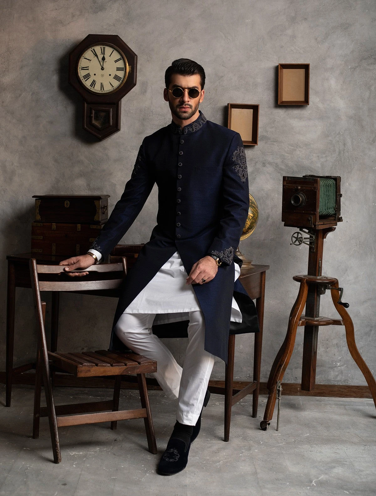 Sherwani: Setting our groom up to ravish in ethereal beauty in this breathtaking blue sherwani with a flowing organic border, made on pure atlas jamawar Pakistani sherwani. With the finest of craftsmanship, this Pakistani groom dress arrives heavy velvet black shawl with highly intricate cutwork, further embellished with a classic blend of gold and silver detailing along with our finest Swarovski crystals and beads on borders of the shawl.