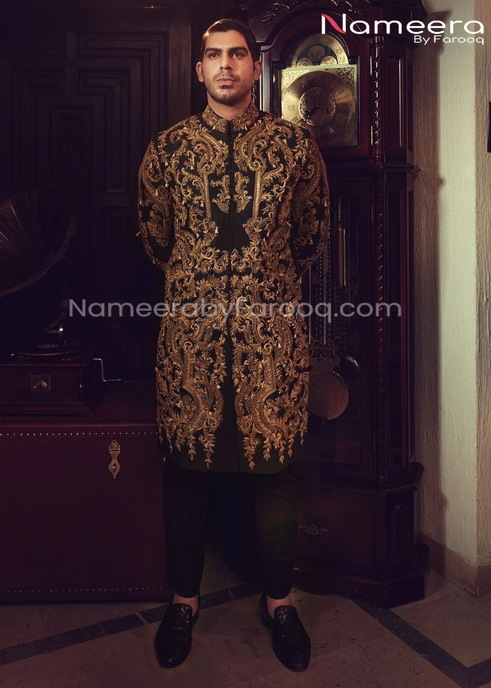 Dulha Sherwani 2021 for Wedding in Black Color in Stylish design embellished with dabka, zardozi work. This Sherwani is looking so beautiful and best choice for groom for wedding event.
