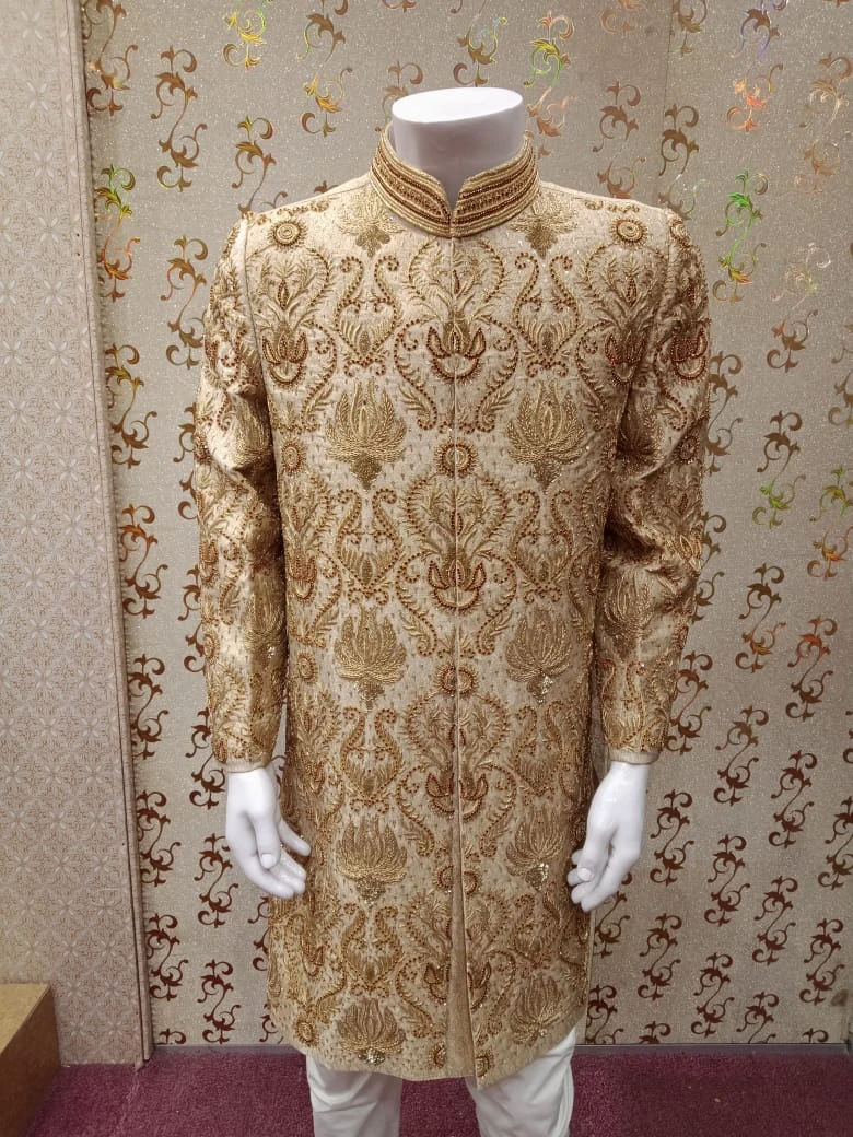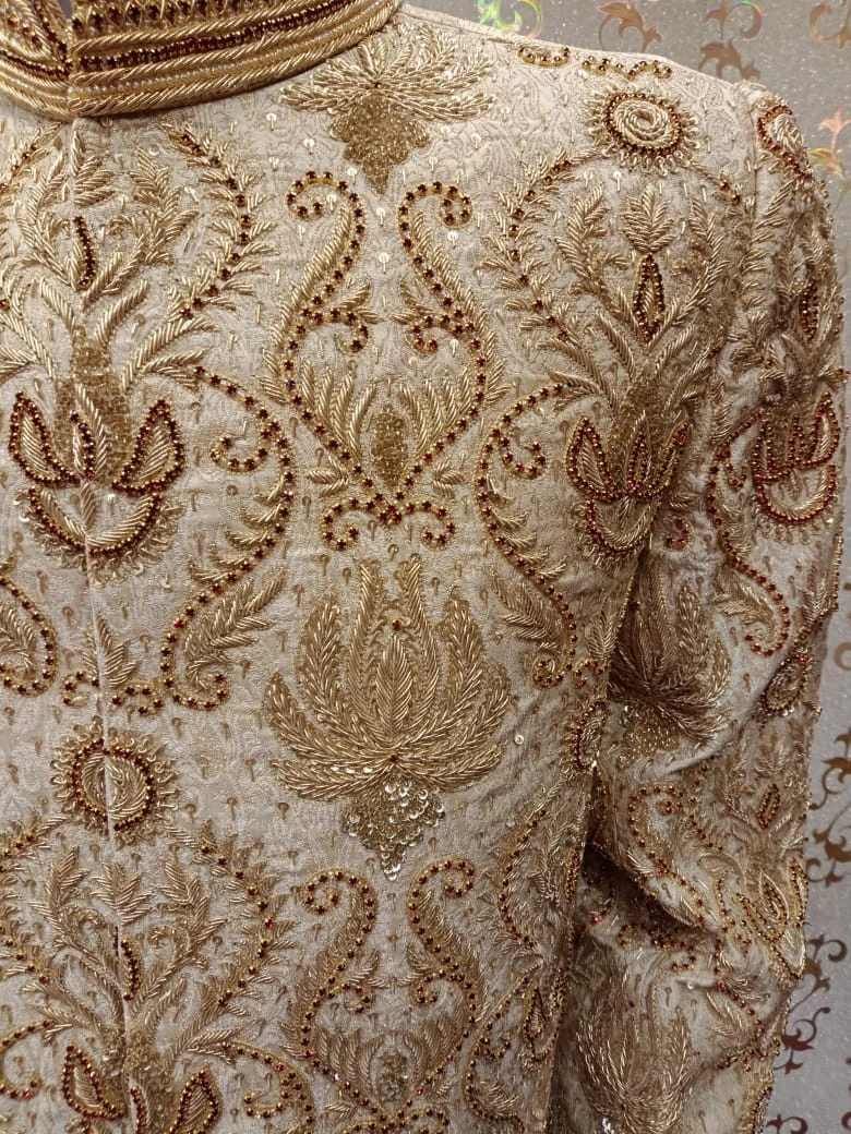 Dulha Sherwani With Turban In Beautiful Golden Color.Work Embellished With Maroon Nagh,Dabka,Zari,And Zardozi Work.