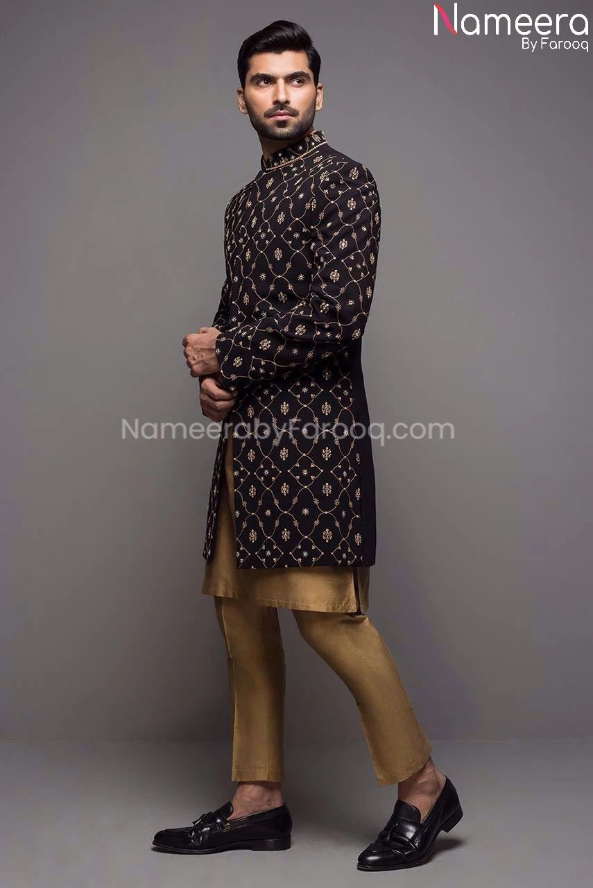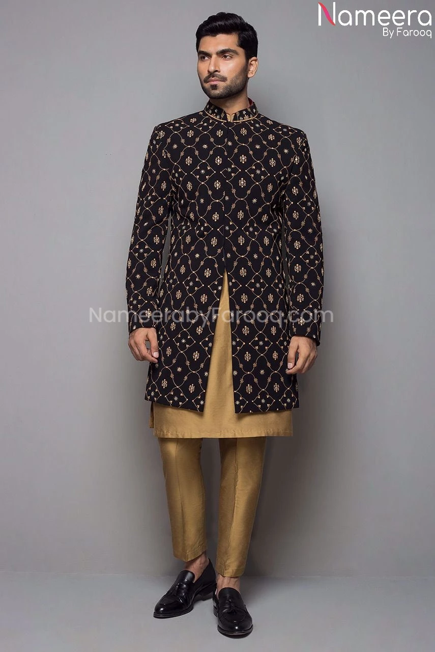 Elegant Black and Gold Sherwani for Men’s Online in Stylish design embellished with resham, anchor work. This Sherwani is looking so beautiful and best choice for groom for wedding event.
