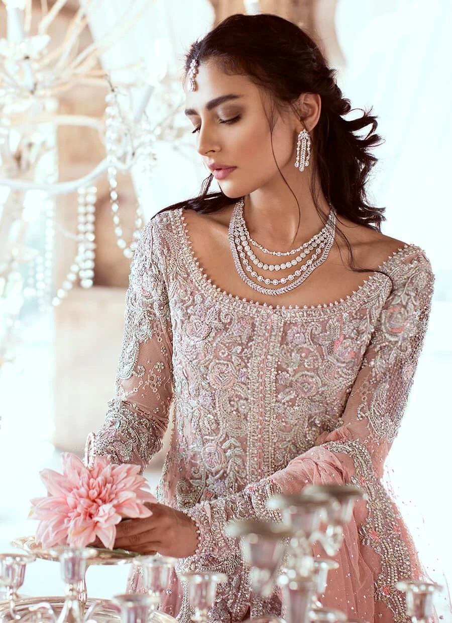 Embellished Blush Petunia Lehenga Gown Pakistani Bridal Dress is an elaborately hand-worked canvas meets a current silhouette with this bridal lavender gown which is made of stiff net and has handwork of zardozi, kora dabka, and cut dana all over the gown.