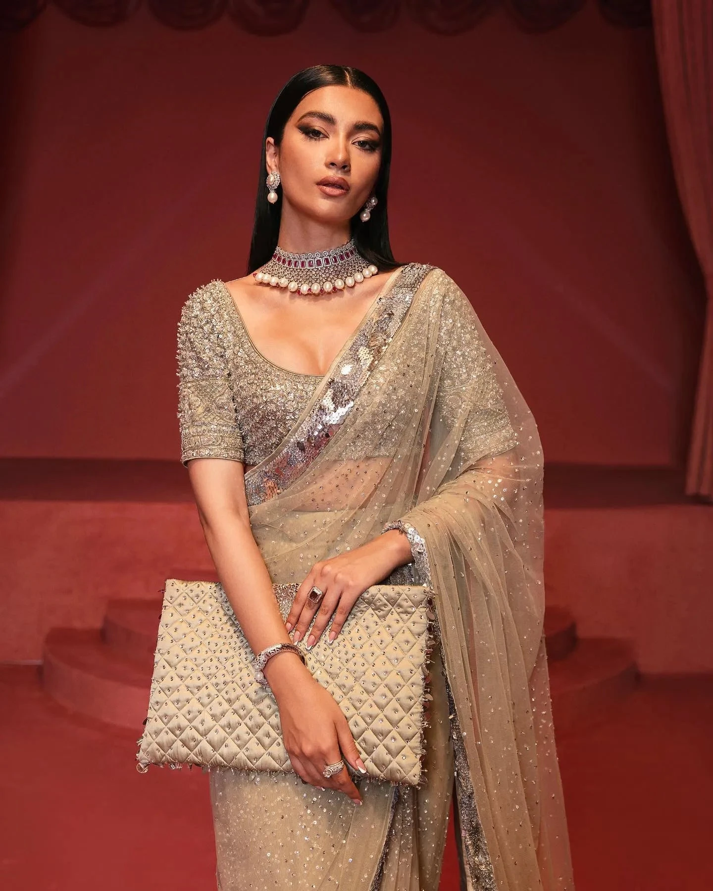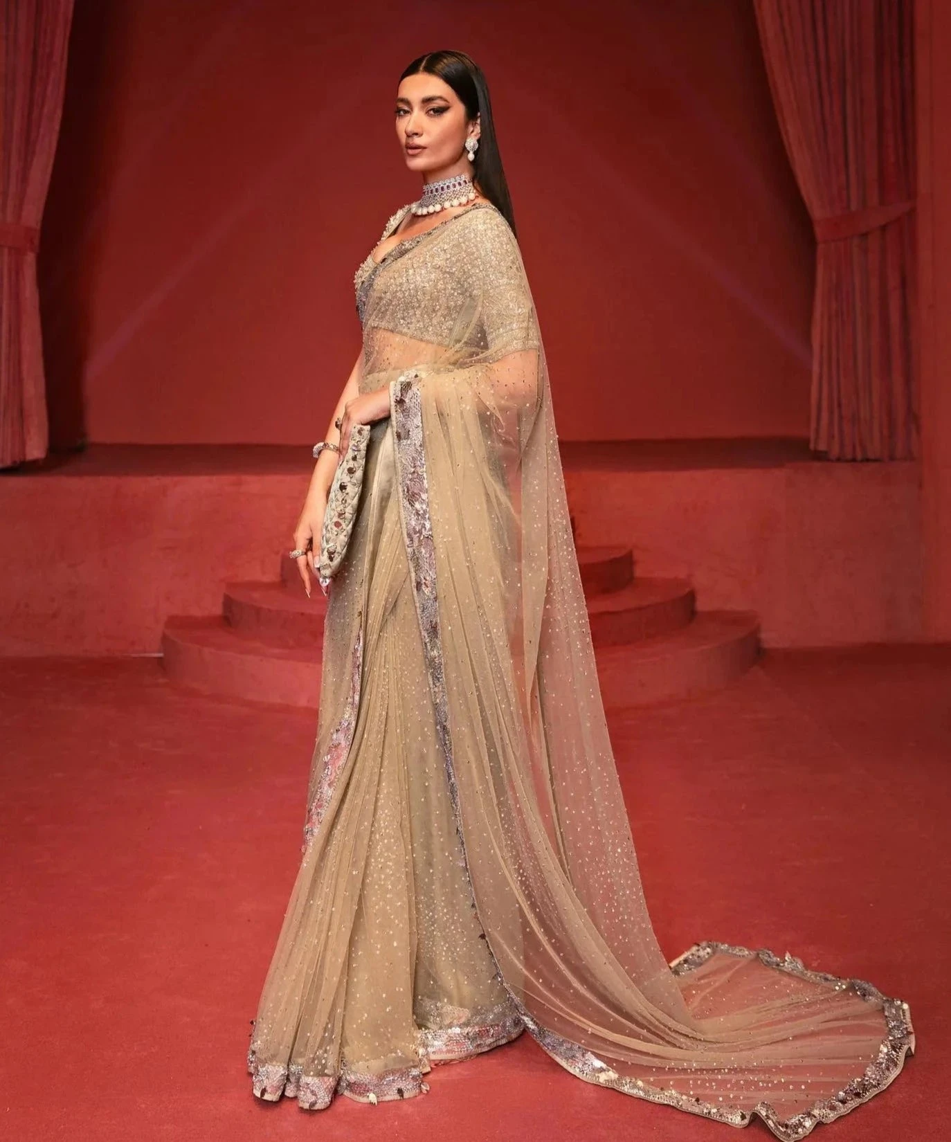 Saree: The Embellished Bridal Saree gives the gorgeous bride a head-turning appearance at the wedding. The Saree is adorned with sequins and swarovski. Silverwork and embellished borders give a glamorous look to this perfectly stitched Bridal Saree masterpiece.