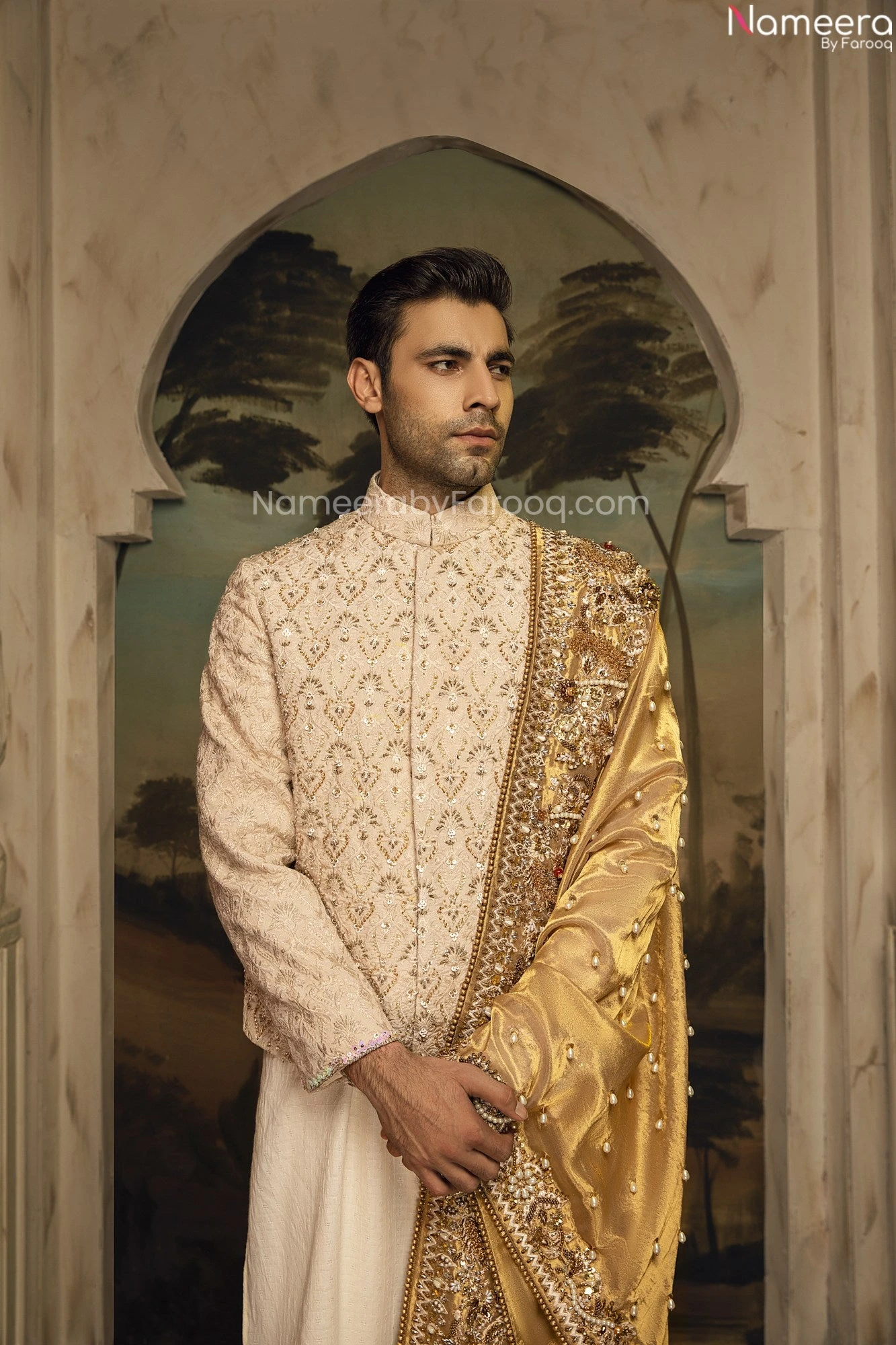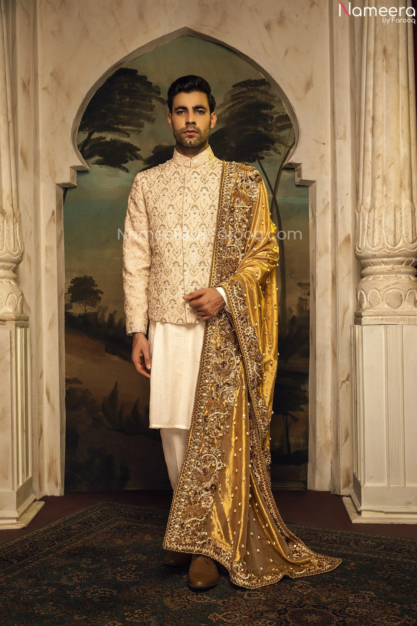 Embellished Grooms Sherwani for Wedding Wear is a magnificent groom dress in waistcoat and sherwani paired with enchanting embellished designer made shawl to make you look like a Maharaja from our old traditional. The same bridal dress as shown can be customized in a separate order(at a separate price).