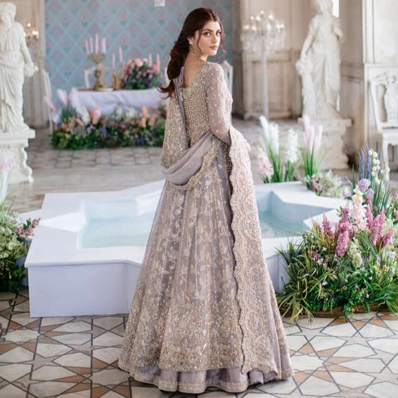 Embellished Lilac Lehenga Gown Pakistani Bridal Wear Our lilac bridal ensemble that is a symbolic celebration of spring. A Refreshing pallet of lilac and gold-silver embellishments frame the peshwas; a twirl of the ensemble reveals layers of decadence. The beautiful sheer sequins spray dupatta is framed with a floral scalloped border on all sides. Join us in the celebrations.