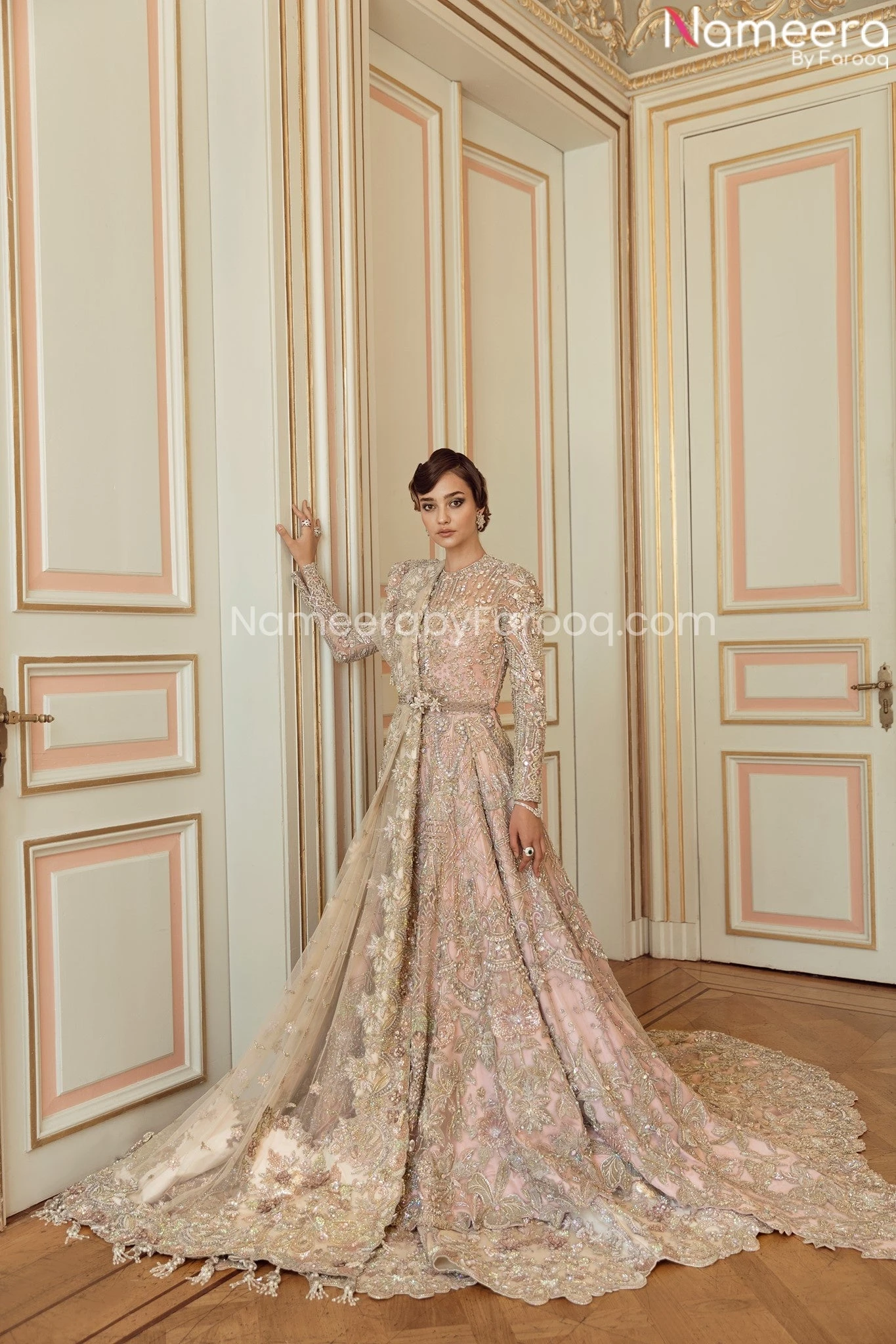 Ivory Pink Indian Wedding Dresses for Bride is Heavily Embellished in zardozi, dabka work covering every inch of the gown with chiffon net base, exaggerated with heavily embroidered chiffon dupatta and embellished waist belt in a new style.