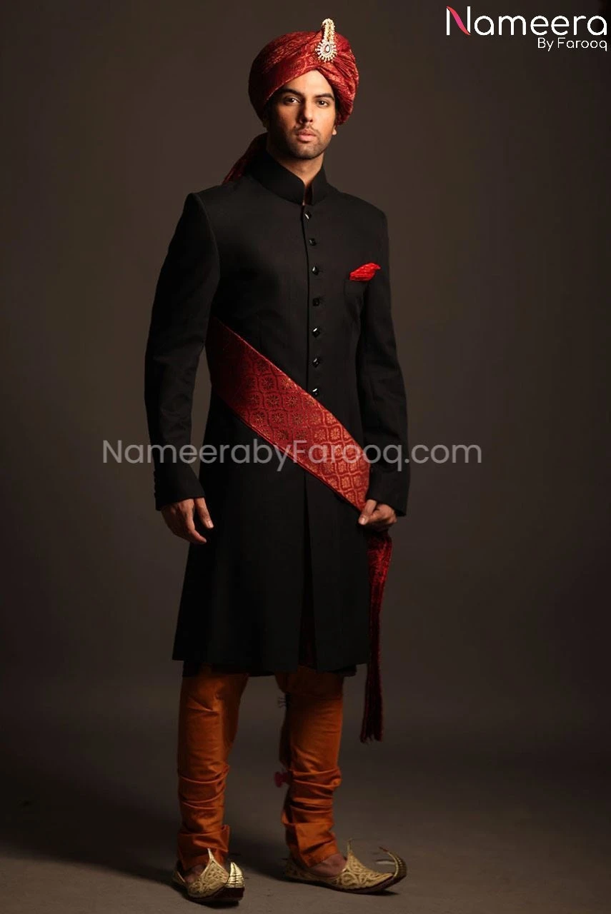 Pajama: Latest Pakistani Black Sherwani for Groom is paired with tight pajama in red color which is giving charming look to sherwani. Fabric used for Pajama is jamawar.