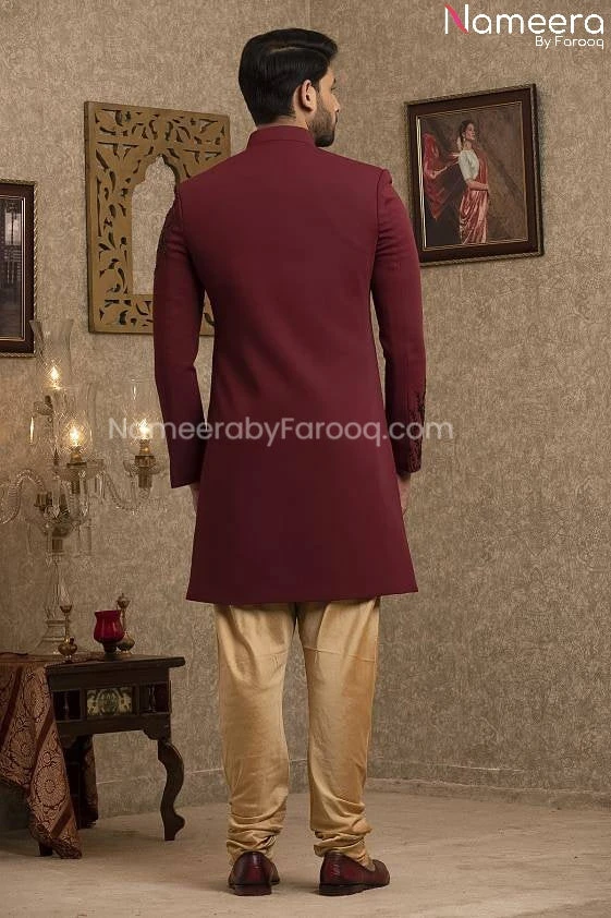 Latest Pakistani Sherwani Style for Groom Online in Stylish design embellished with zari, dabki embroidery. This ethnic sherwani set is made from fine quality material.