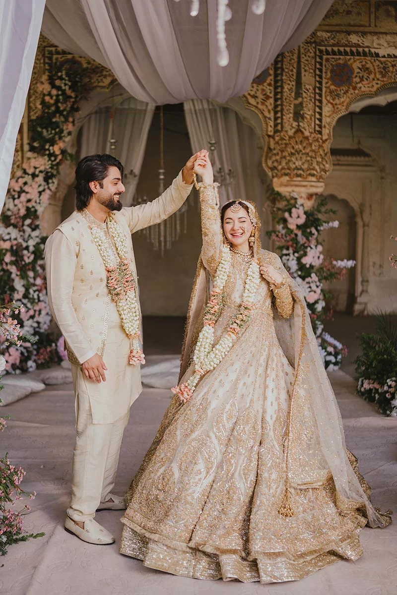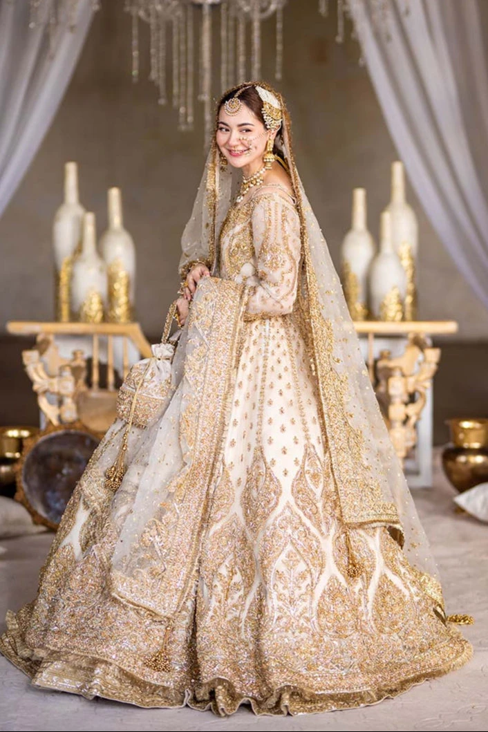 Off White Pishwas and Lehenga Pakistani Bridal Dress is an embellished attire adorned with Zari, Resham, Dabka, Sequins, and Embroidery. Goldwork, lavish designs, and premium quality fabric make this stunning Pishwas Dress an epitome of beauty and grace.