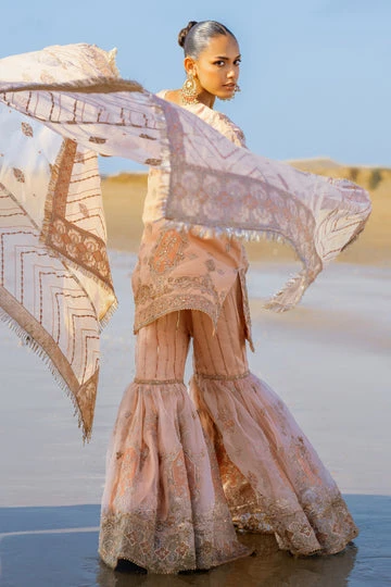 Pakistani Bridal Dress Beige Peach Embellished Kameez Sharara is a handcrafted and embroidered shirt with deep jeweled tones, machine embroidery, heavy hand adda embellishments comprising sequin, naqshi, dabka & cut dana, minimal lace, and ornamented motifs.