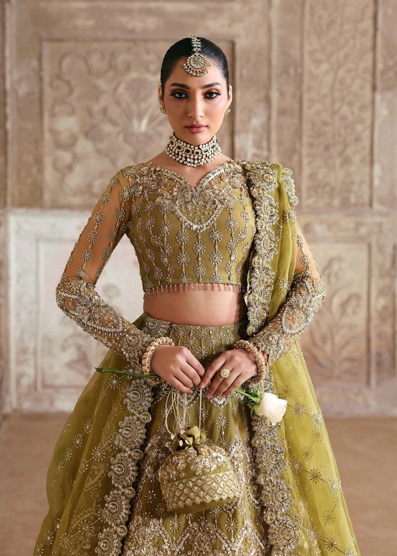 The beautiful choli in an alluring green color comes in premium net fabric and is beautifully embellished with cut-dana, dabka, embroidery, and tilla work. Shimmering details, sequins, pearls, and hanging motifs give a glamorous touch to this choli, making it a perfect choice to pair with Lehenga.