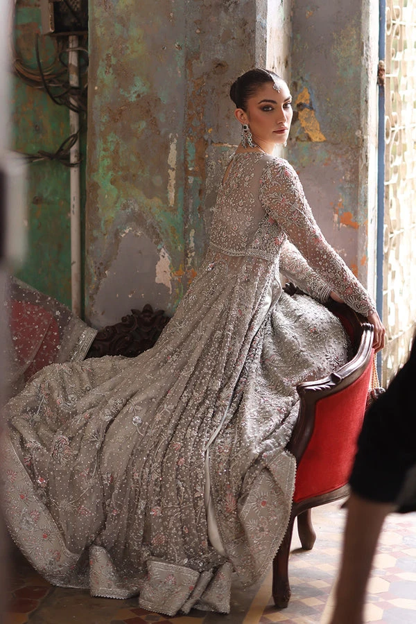 Pakistani Bridal Dress in Grey Pishwas Lehenga Style is a stunning masterpiece adorned with floral motifs, embroidery, intricate designs, and lavish contrast of pink.