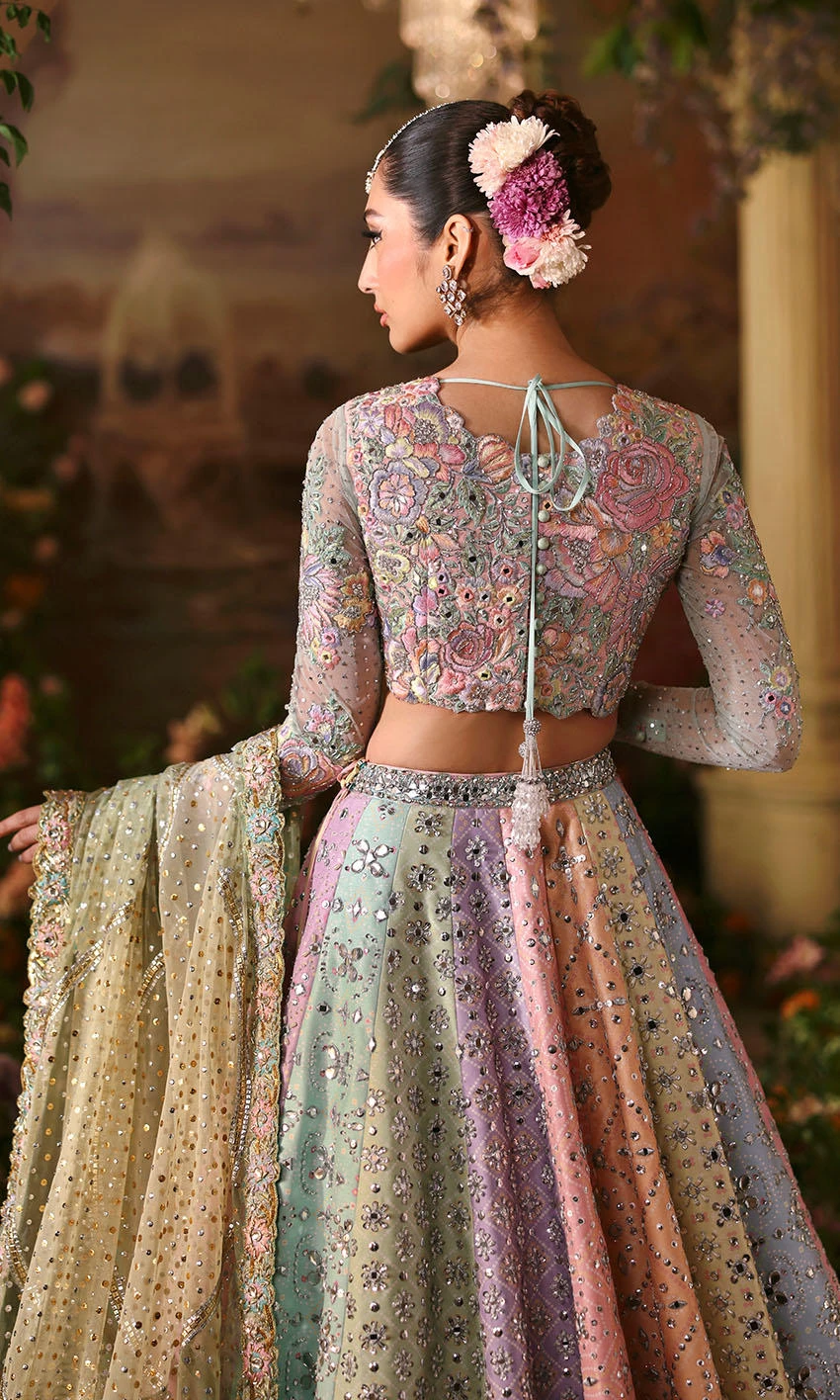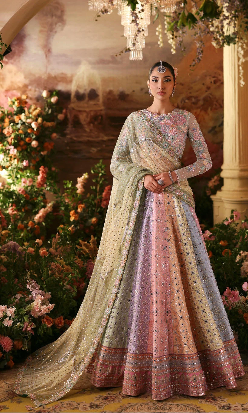 Pakistani Bridal Dress in Multicolored Lehenga Style is paired with an embellished choli, creating a flawless masterpiece for the big day. Hand-crafted work of embellishments, embroidery, and mirror work make this Lehenga Choli in raw silk fabric an epitome of beauty and your priority to have a magical look.