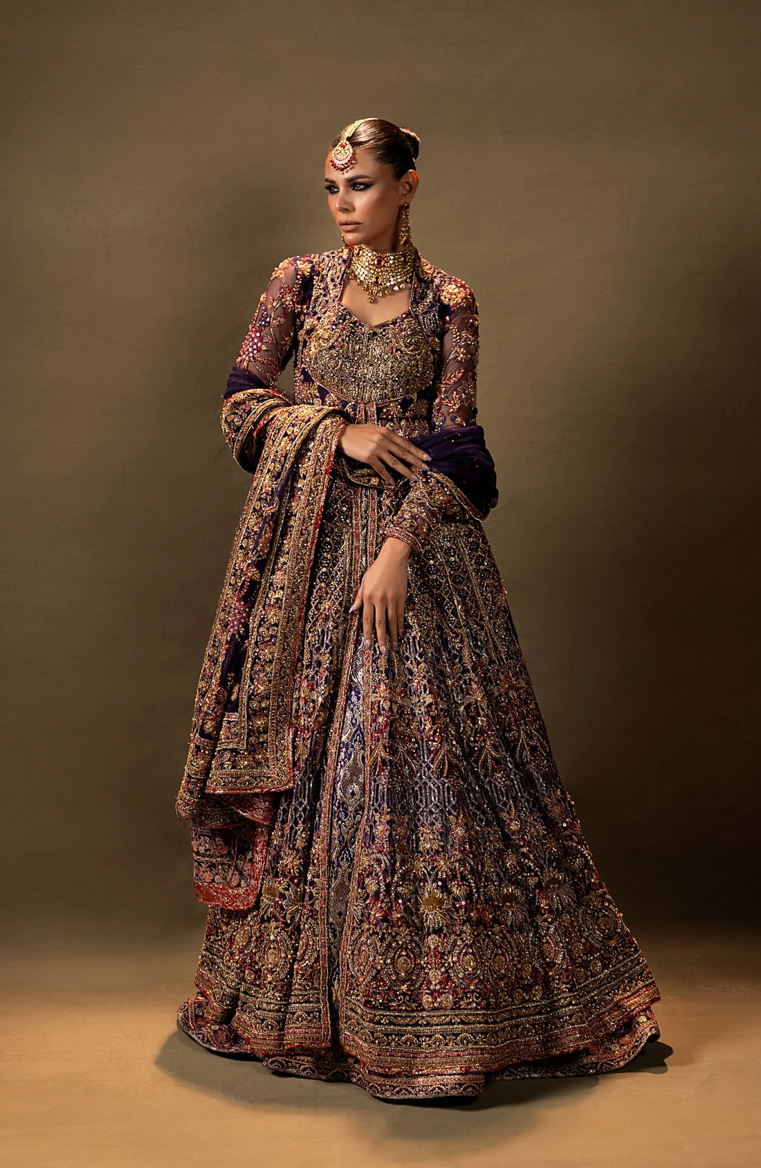 Pakistani Bridal Dress in Purple Gown and Lehenga Style is an iconic bridal attire that will take you back to your cultural roots. Hand-crafted work of embellishments and lavish designs make this stunning Pakistani Bridal Gown and Jamawar Lehenga an epitome of beauty.