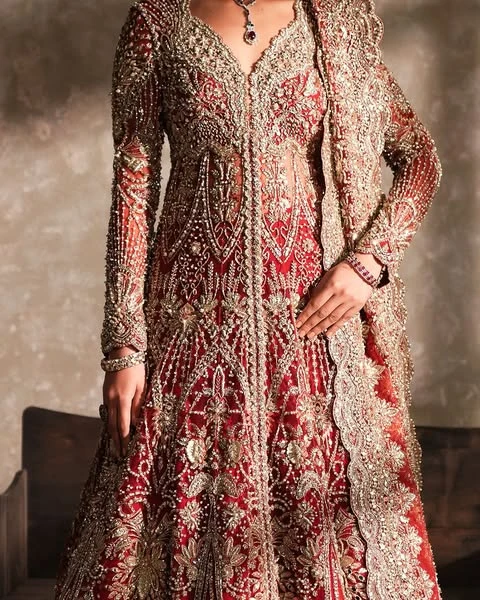 Pakistani Bridal Dress in Red Gown and Lehenga Style is an epitome of beauty and tradition. Hand-crafted details of embellishments and lavish designs will make this Lehenga Gown a perfect choice to have a trendy wedding look.