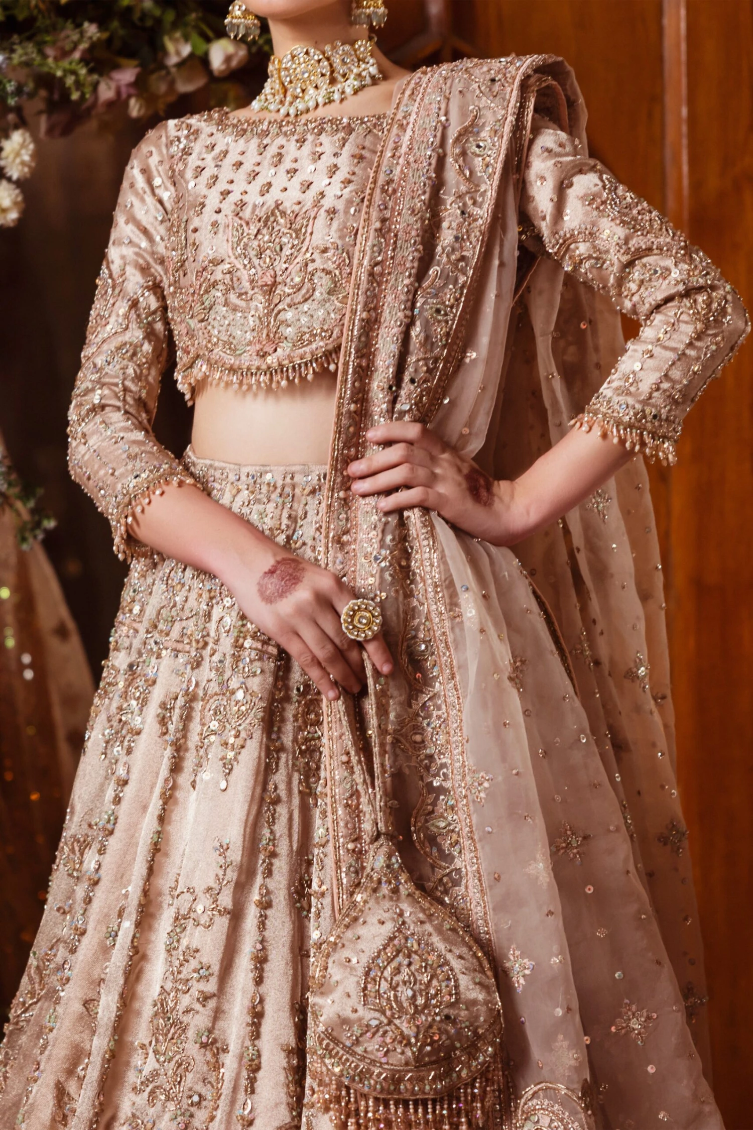 Pakistani Bridal Dress in Tissue Choli Lehenga Style has premium tissue fabric. Embroidery, cut-dana, Resham, tilla, crystals, Sequins, and motifs make this perfectly stitched Bridal lehenga choli an epitome of beauty and your priority to have a magical wedding look.