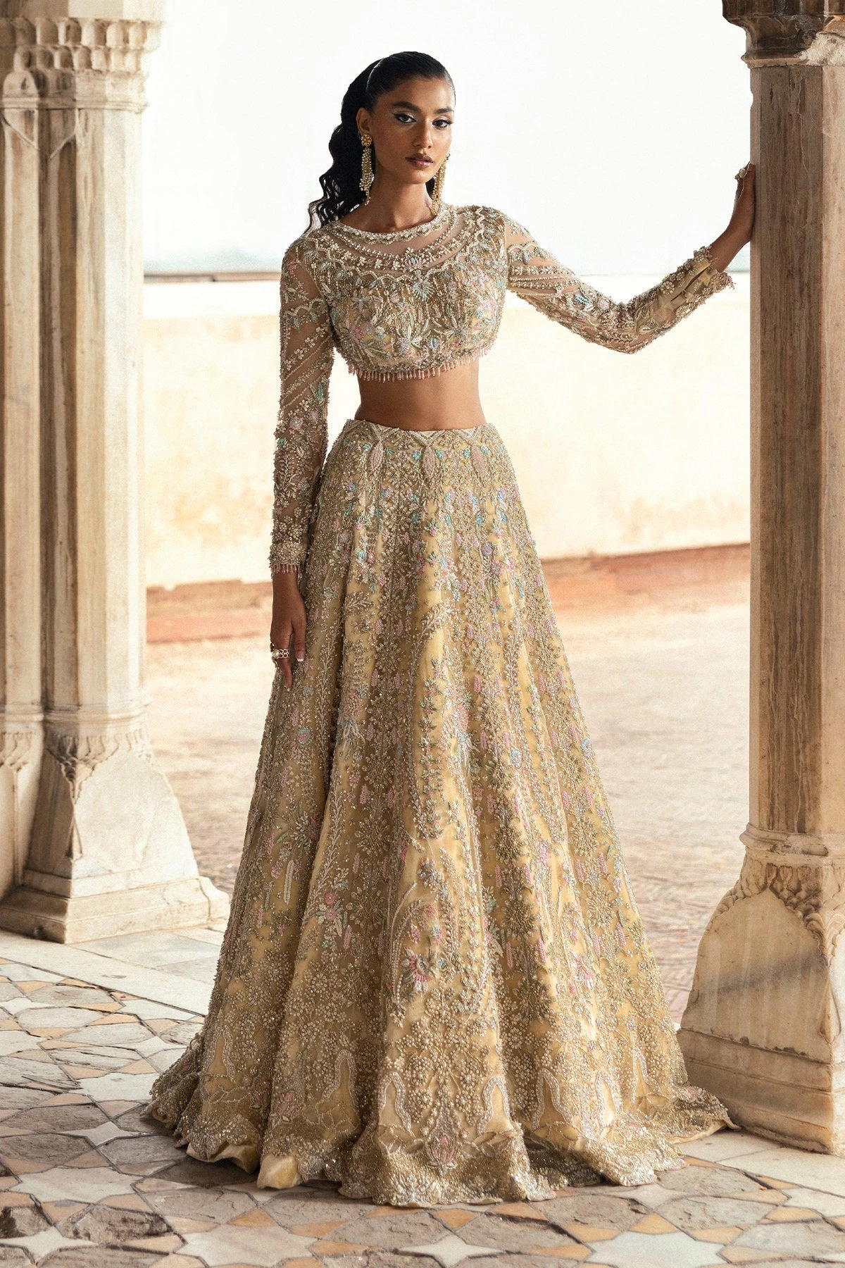 Pakistani Bridal Dress in Yellow Choli Lehenga Style is beautifully emblazoned with embroidery and beads. Hand-crafted details of embellishments and lavish contrast of Blue make this stunning Bridal Lehenga Choli a perfect choice to wear on your big day.