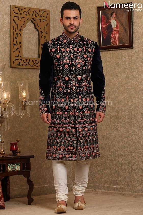 Sherwani: Beautiful Sherwani in navy blue color is embellished with resham embroidered pure heavy hand beaded work on mandarin collar neckline, sleeves end and on front & back panel. Sherwani fabric is Velvet.
