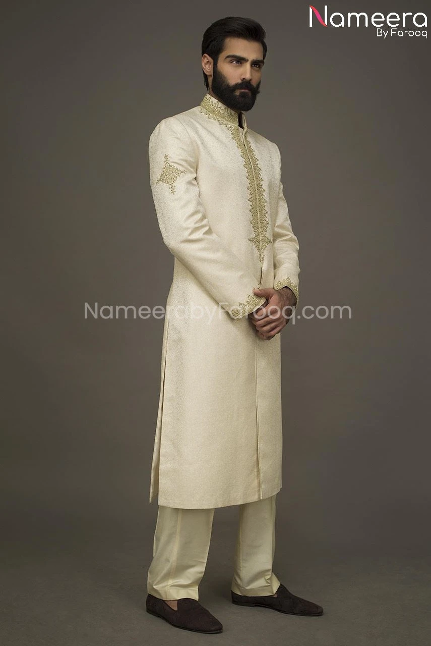 Pajama: Pakistani Embroidered Groom Sherwani Dress is paired with Off White pajama which is giving charming look to sherwani. Fabric used for Pajama is Jamawar.
