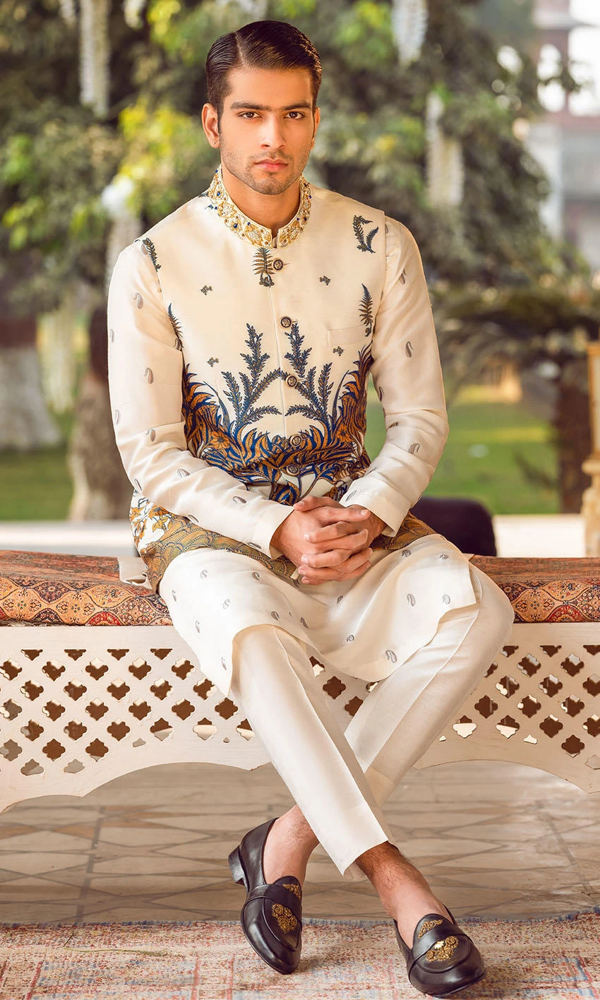 Pajama: The white kurta is paired with a pajama to create a classic Pakistani Groom Dress. The pajama is perfectly stitched and it can be customized to Shalwar to have a more traditional appearance at the wedding.