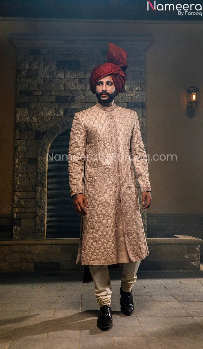 Pakistani Salwar Kameez Mens Sherwani with Turban is something about a man who is debonair and warmly embraces his nationality. This bronze sherwani is designed in rich kimkhab fabric. The look is completed with tassels adorned with a red organize turban which adds sophistication to the outfit.