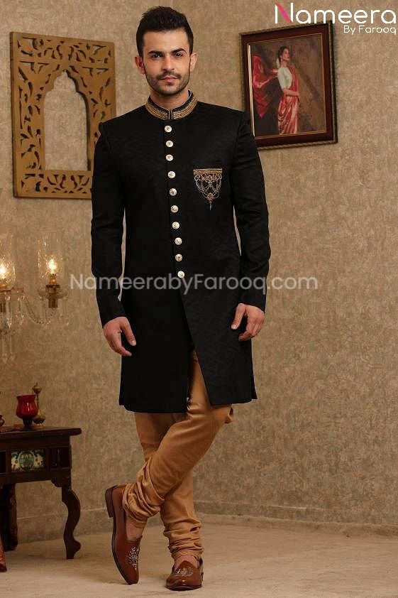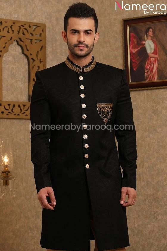 Pajama: Pakistani Sherwani Black for Groom Online is paired with off white Churidar pajama which is giving charming look to sherwani. Fabric used for Pajama is Cotton Silk.