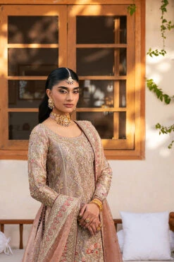 Pakistani Wedding Dress in Blue Pishwas Frock Style is adorned with lavish designs, motifs, and floral designs. Beautiful chiffon dupatta give a perfect finishing to this Pishwas Dress.