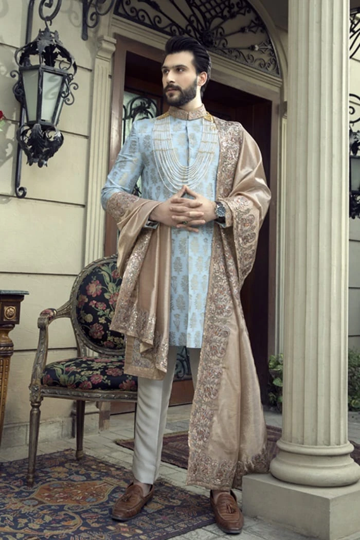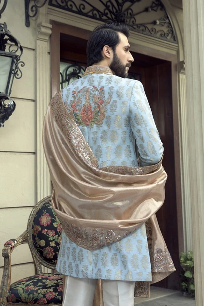 Sherwani: Classy Sherwani in sky blue color is embellished with dabka zari work on sleeves. Front is fully embroidered and neckline is decor with dabka, zari work. Sherwani fabric is jamawar.