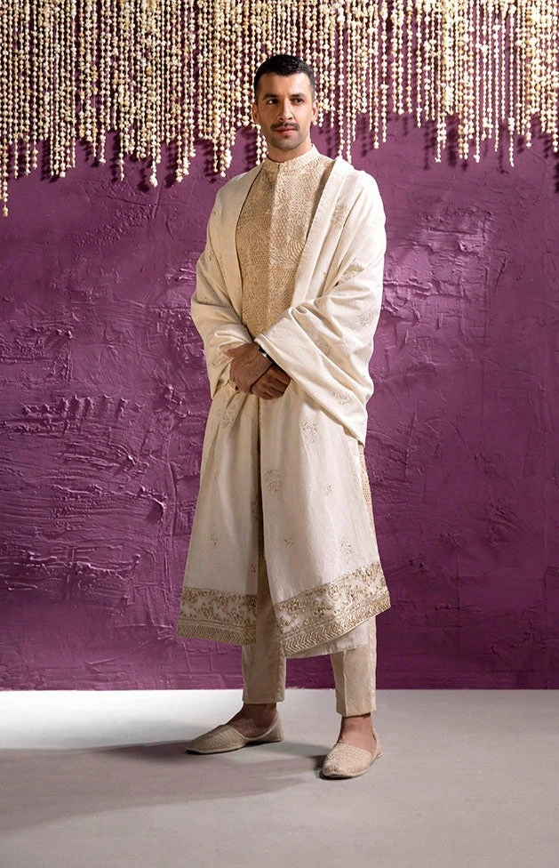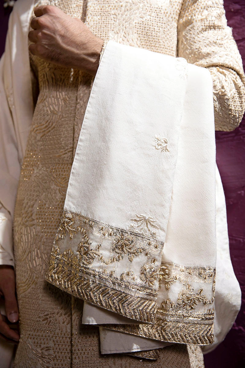 Shawl: An embellished shawl is prepared on customized orders to pair with this magnificent Sherwani Dress. Embroidery details and goldwork make this shawl a chic choice to have a magnificent look.