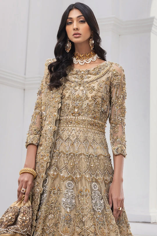 Maxi: Pakistani Bridal Maxi in the alluring gold shade is hand-crafted with the lavish details of pearls, motifs, zardosi, pearls, beads, and crystals. This stunning Bridal Maxi is fully embellished with intricate designs and fine details, making it a beautiful choice for the gorgeous bride.