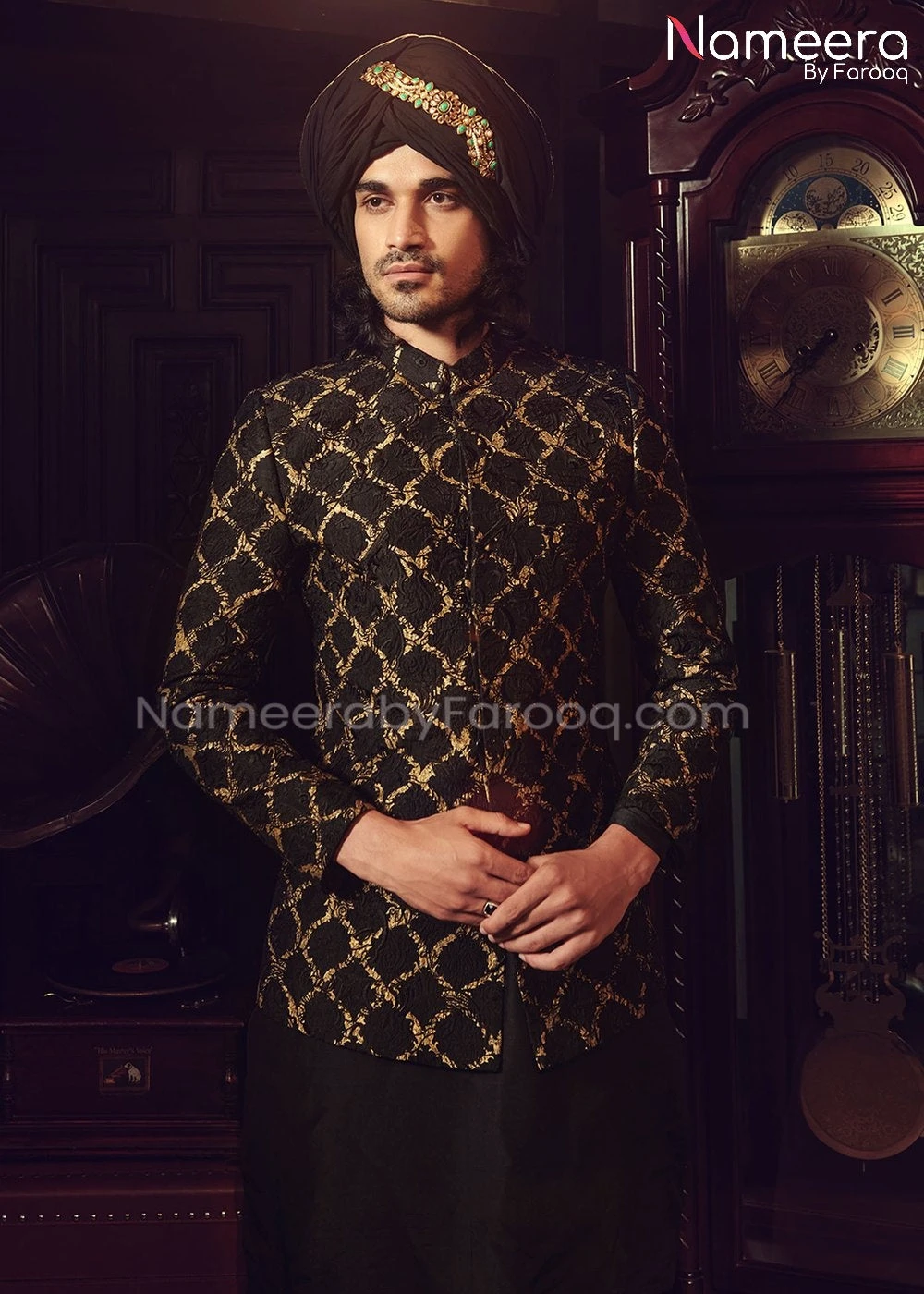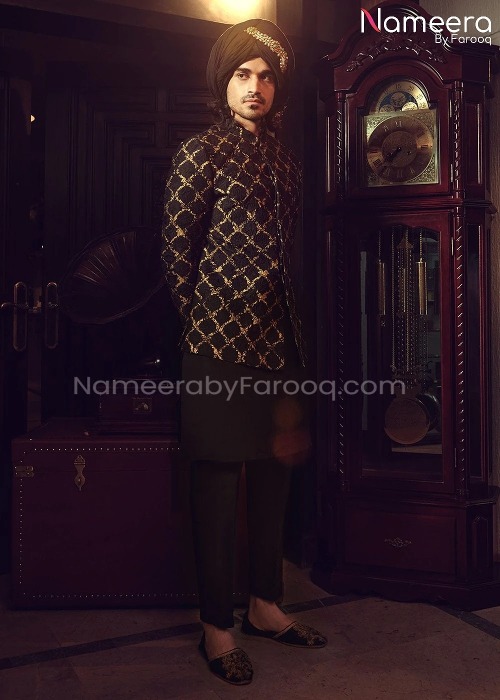 Sherwani: Classy Sherwani in Black color is paired with embroidered jackeT fully embellished with dabka embroidery. Jacket sleeves is embellished with embroidery. Sherwani fabric is jamawar. It is also paired with traditional Kulla which is looking so elegant.
